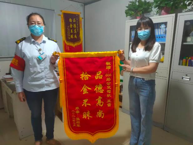 7月20日下午吳先生帶著(zhù)一面“拾金不昧,品德高尚”的錦旗來(lái)到了新巴士公司38路調度室對駕駛員李倩倩表示感謝。