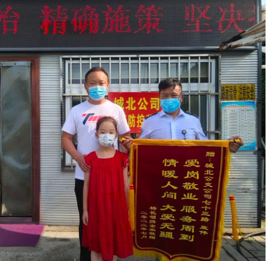 7月24日上午,市民張先生一家人專(zhuān)程來(lái)到楊山路調度室,將一面寫(xiě)有“愛(ài)崗敬業(yè)、服務(wù)周到、情暖人間、大愛(ài)無(wú)疆”字樣的錦旗送到73路駕駛員鹿偉的手中,感謝他幫助迷路的孩子找到家人。