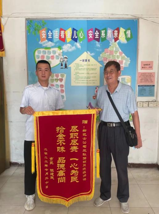 2022年7月25日上午,市民陳老先生拿著(zhù)一面印有“盡職盡責一心為民,拾金不昧品質(zhì)高尚”的錦旗,來(lái)到徐州公交新巴士公司湖濱調度室,表?yè)P和感謝18路公交駕駛員張猛。