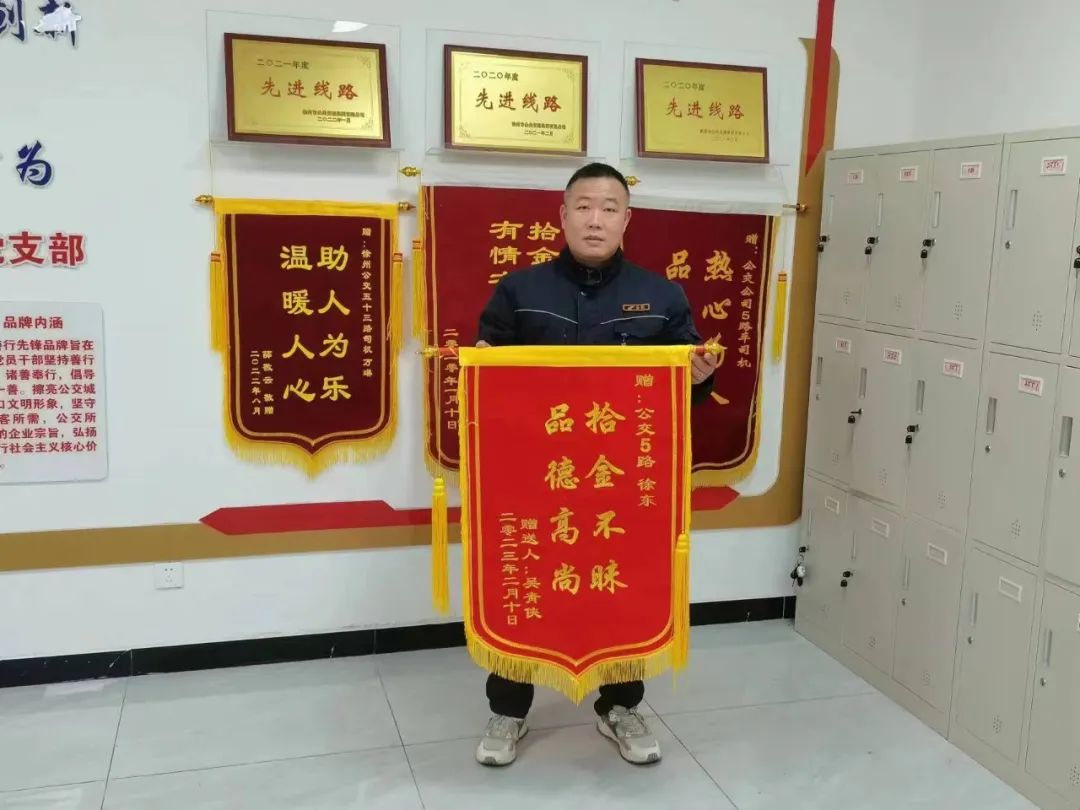 2月12日,王女士帶著(zhù)印有“拾金不昧 品德高尚”的錦旗再次來(lái)到了御景灣調度室,親手送到了駕駛員徐東的手中以表感謝。