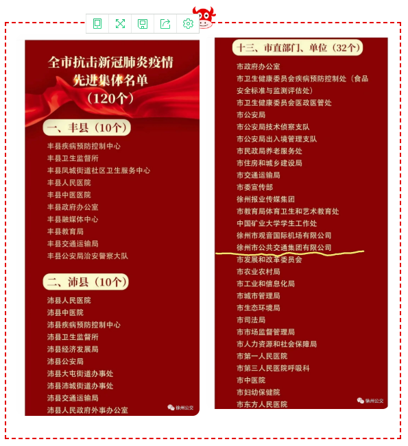 2月20日,在徐州市高質(zhì)量發(fā)展暨抗擊新冠肺炎疫情總結表彰大會(huì )上,399名先進(jìn)個(gè)人、120個(gè)先進(jìn)集體喜獲殊榮,其中徐州市公共交通集體有限公司榮獲“徐州市抗擊新冠肺炎疫情先進(jìn)集體”榮譽(yù)稱(chēng)號。