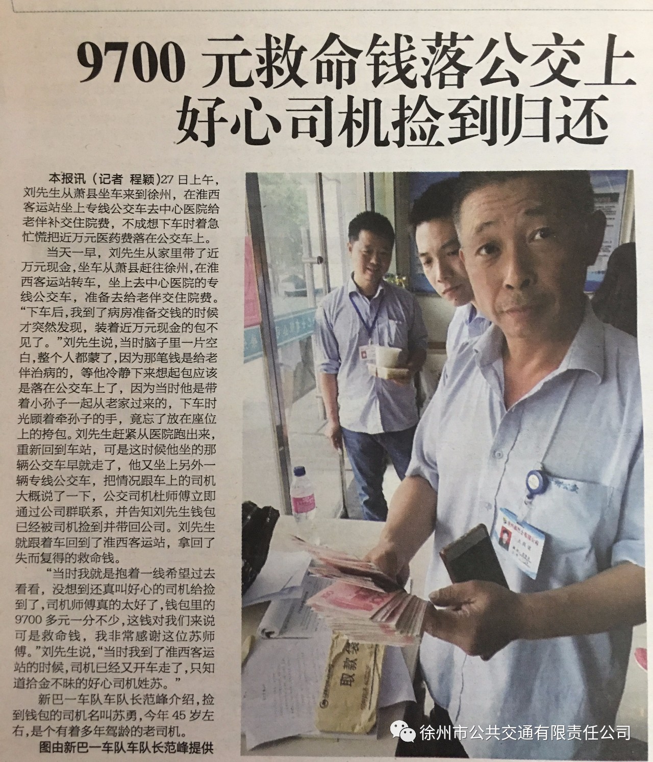 車(chē)隊管理人員打開(kāi)包尋找乘客的聯(lián)系方式,發(fā)現包里有一個(gè)信封,信封里面裝著(zhù)9700元現金,便立即將包妥善保管。不久,失主劉先生來(lái)到調度室尋找,看到失而復得的包裹十分激動(dòng),他說(shuō):“我抱著(zhù)一線(xiàn)希望來(lái)這兒看看,沒(méi)想到還真叫好心的司機給撿到了,9700元一分不少。這錢(qián)對我們來(lái)說(shuō)是救命錢(qián),今早到醫院給老伴補交住院費的,我非常感謝蘇師傅”。