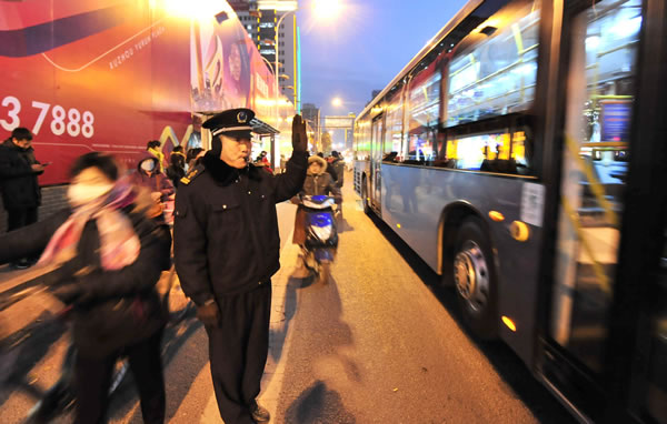 平安夜,客流增加,公交服務(wù)督導隊員有序指揮車(chē)輛,確保乘客走好走了