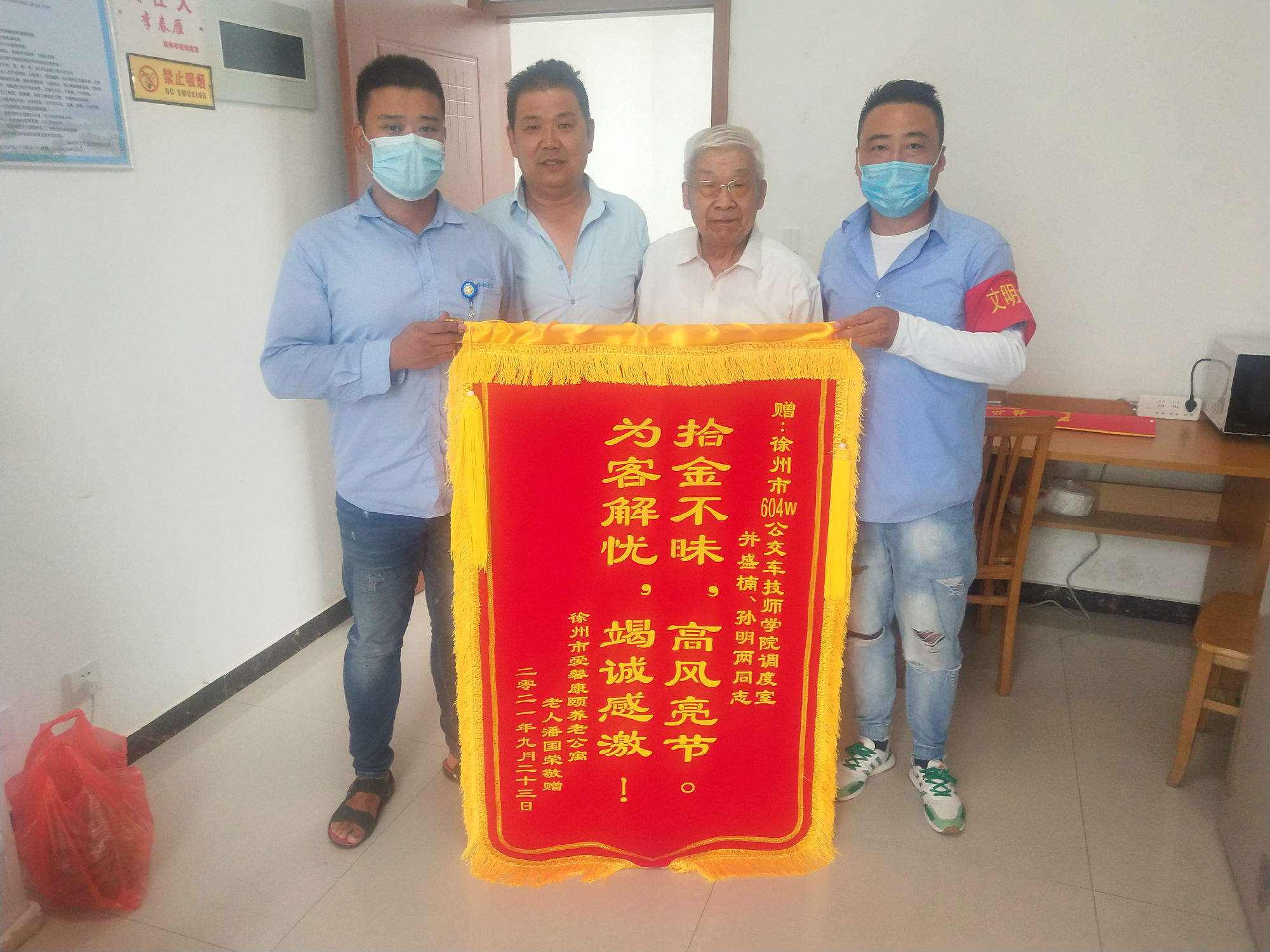 近日,一位老先生在家人的攙扶下,來(lái)到了城北公司604路技師學(xué)院調度室,將一面印有“拾金不昧,高風(fēng)亮節,為客解憂(yōu),竭誠感謝”字樣的錦旗送到604路駕駛員孫明和調度員盛楠手中。