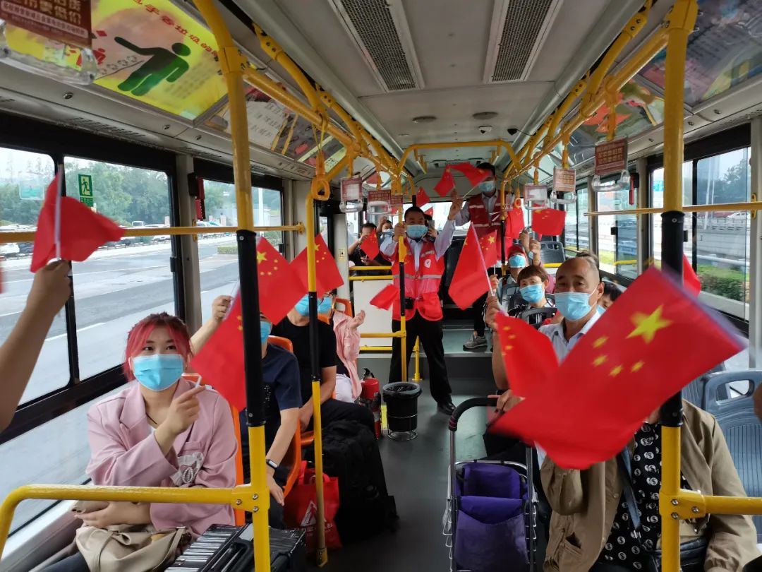 志愿者們走進(jìn)公交車(chē)廂,現場(chǎng)與乘客們互動(dòng),通過(guò)提問(wèn)節日和防疫小知識,獎勵口罩、紅旗、鑰匙環(huán)等小禮物,并與市民乘客們共唱《我和我的祖國》,熱鬧歡慶的氣氛感染了整個(gè)車(chē)廂,彰顯了“奉獻、友愛(ài)、互助、進(jìn)步”的志愿精神。