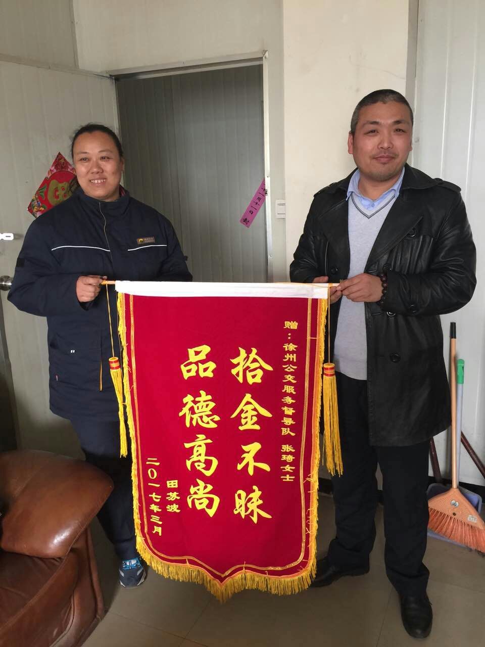 3月29日,正在站臺執勤的督導員張琦撿到乘客掉落的公文包,經(jīng)查看發(fā)現包內有蘋(píng)果筆記本一臺和一個(gè)錢(qián)包,但并沒(méi)有找到皮包主人的聯(lián)系方式。張琦把包放在了調度室等待失主來(lái)認領(lǐng),約一小時(shí)后失主匆忙趕來(lái)尋找。失主見(jiàn)到失而復得的皮包非常激動(dòng),經(jīng)過(guò)詢(xún)問(wèn)得知失主姓田在徐州礦業(yè)大學(xué)工作。田先生說(shuō),“電腦里存有非常重要的資料和聯(lián)系方式,丟包之后萬(wàn)分焦急,真心感謝公交督導員?!彪S即從錢(qián)包里拿出400元錢(qián)塞給張琦作為答謝,張琦表示:“路不拾遺本就是自己的義務(wù),作為站臺督導員經(jīng)常會(huì )在站臺撿到乘客掉落的物品,不管東西貴重與否我們都會(huì )幫失主妥善保管等待認領(lǐng)?!?/span>3月31日,田先生和他的愛(ài)人送來(lái)錦旗表示感謝!