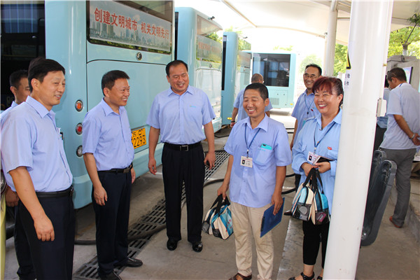 炎炎烈日下,空調公交車(chē)成為市民出行首選。為給市民營(yíng)造舒適、涼爽的乘車(chē)環(huán)境,各運營(yíng)公司應用公交GPS智能調度系統,科學(xué)調度、靈活排班、保證運力充足。同時(shí),結合創(chuàng )建工作,提高服務(wù)質(zhì)量,全市2100多輛空調車(chē)全部開(kāi)足冷氣;駕乘人員揮汗如雨堅持“一趟一清掃”,認真做好車(chē)輛清潔工作;督導隊員冒著(zhù)高溫在各大站臺維持秩序、扶老攜幼、做好導乘服務(wù)、嚴查易燃易爆及危險品。由于各項舉措落實(shí)到位,確保了高溫期間全市161條公交線(xiàn)路運營(yíng)順暢,乘客走好走了。(圖為董事長(cháng)、總經(jīng)理杜紅軍,總經(jīng)理助理李修超一行在食品城充電站慰問(wèn)堅守崗位的充電員工。)