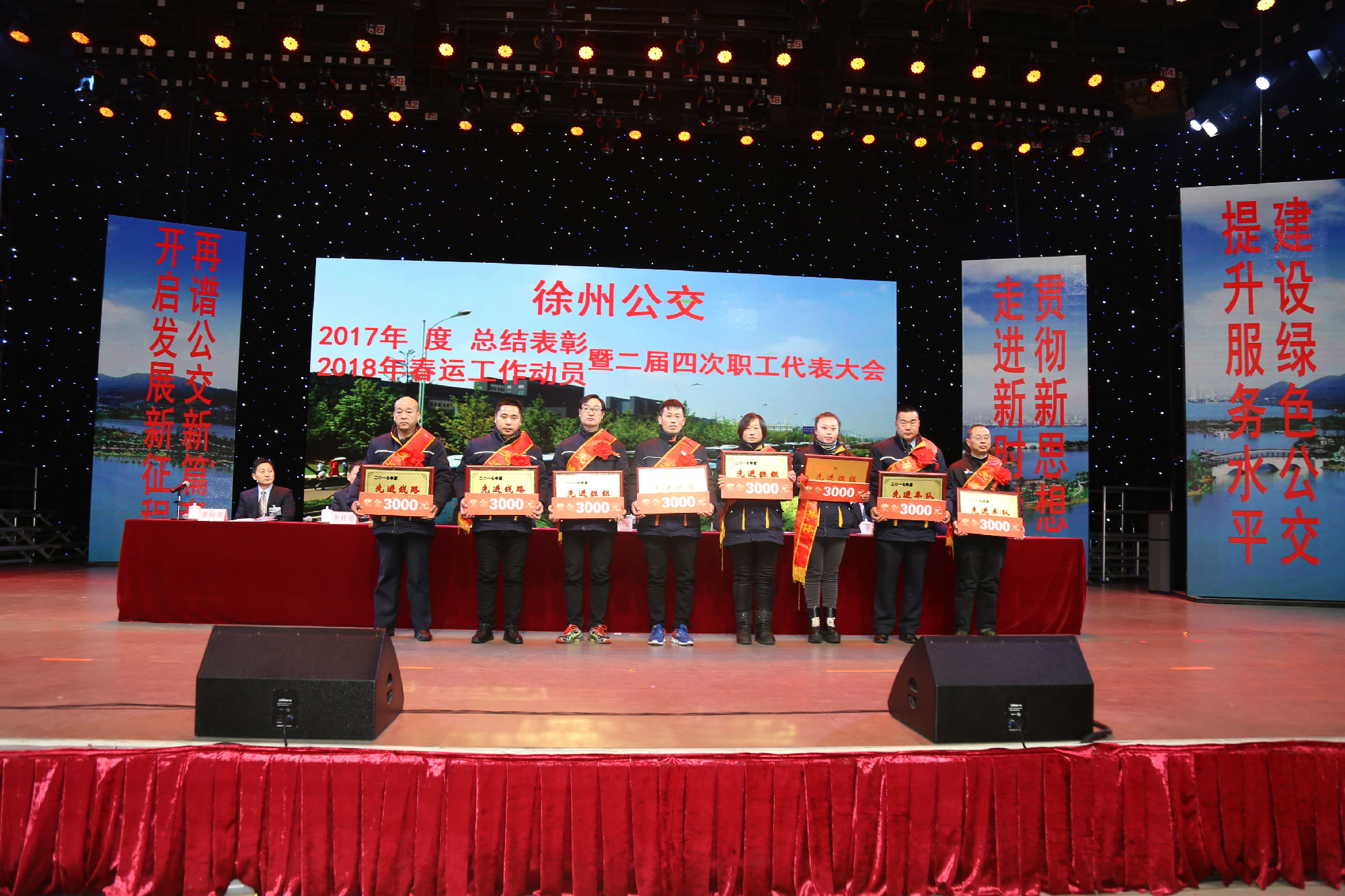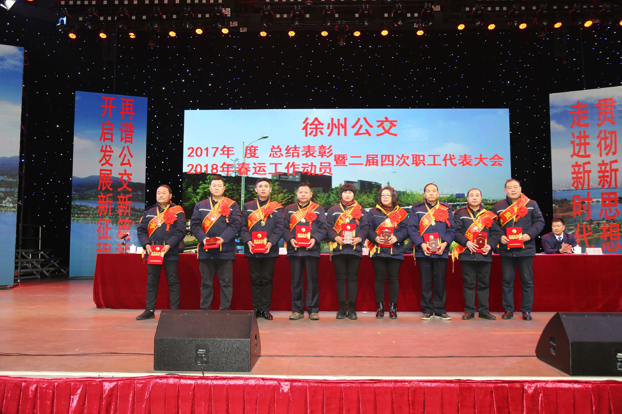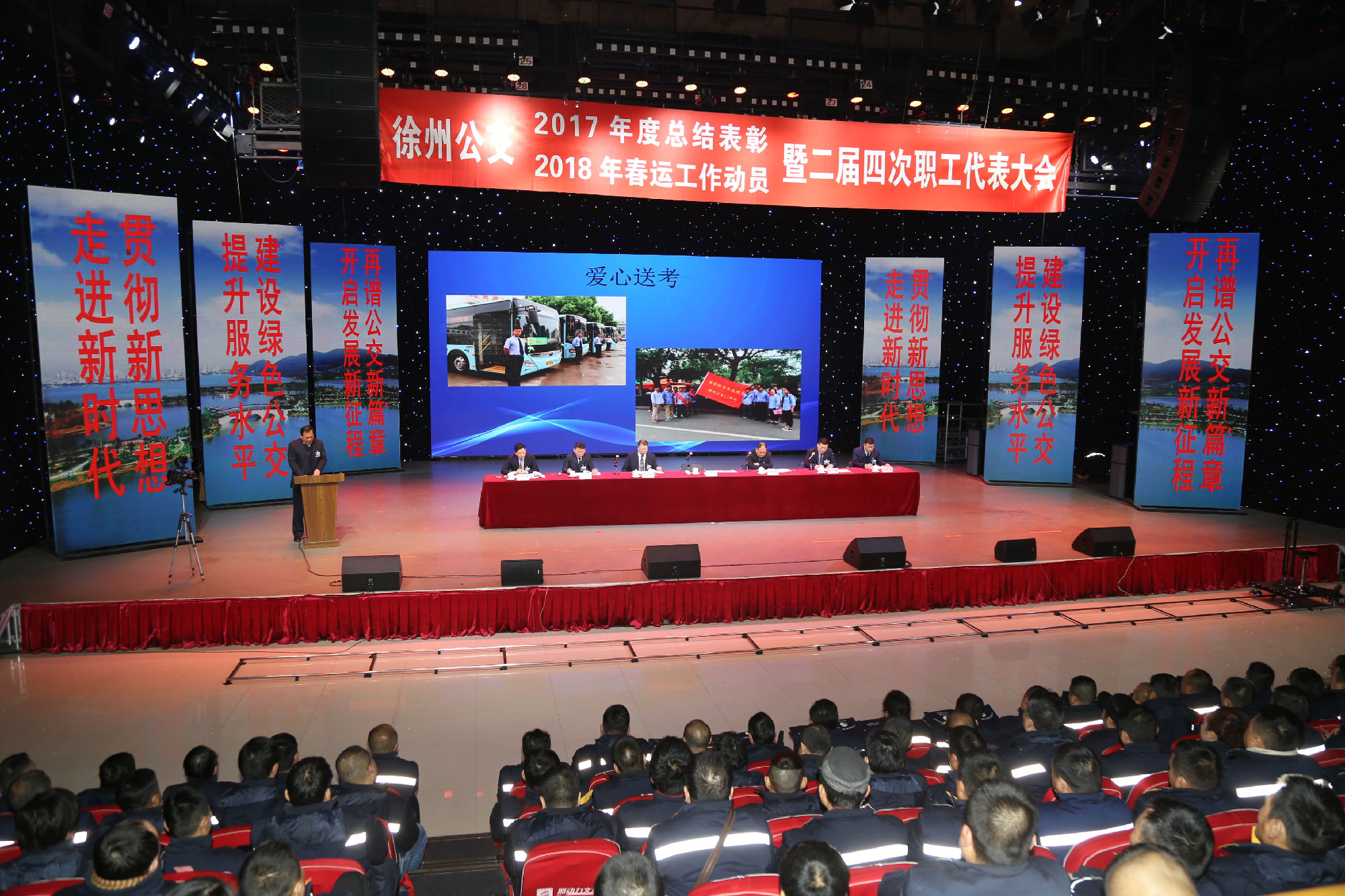 大會(huì )在莊嚴的國歌聲中拉開(kāi)序幕。公司董事長(cháng)、總經(jīng)理杜紅軍首先作經(jīng)理工作報告,對2017年“改革創(chuàng )新年”工作進(jìn)行了全面總結:一、實(shí)施“同城同價(jià)”,優(yōu)化運營(yíng)管理,實(shí)現服務(wù)水平新突破。連續第五年面向全市征集線(xiàn)路線(xiàn)網(wǎng)優(yōu)化意見(jiàn)近3000條,據此新辟優(yōu)化線(xiàn)路29條。二、深化資源共享,在互聯(lián)網(wǎng)+企業(yè)管理上譜寫(xiě)新藍圖。繼續深化集中維修,推行集中例檢。論證實(shí)施支付寶、微信、銀行卡閃付等智能化移動(dòng)支付方式。三、深化文明創(chuàng )建,打造優(yōu)秀公交,服務(wù)民生出行贏(yíng)得新口碑。在國檢、省檢中未失一分,圓滿(mǎn)完成創(chuàng )建驗收任務(wù)。投訴總數和有責投訴同比實(shí)現“雙下降”。乘客表?yè)P同比上升近20%。公司在2016年行風(fēng)熱線(xiàn)上線(xiàn)單位滿(mǎn)意度評議投票中名列榜首。率先打造公交行業(yè)禮讓斑馬線(xiàn)嶄新形象,圓滿(mǎn)完成公交反恐防暴工作。四、著(zhù)力綜合管理,聚合內生動(dòng)能,增強企業(yè)發(fā)展新優(yōu)勢。重新修訂2012版管理制度匯編和新版《徐州公交獎懲條例》。五、踐行十九大精神,推進(jìn)和諧發(fā)展,開(kāi)創(chuàng )黨群工作新面貌。接著(zhù),杜總分析了工作中存在的問(wèn)題,提出下步工作重點(diǎn)。一、建設現代化公交,提升經(jīng)營(yíng)管理水平,保障企業(yè)良性有序運行;二、踐行集約共享理念,深化科技應用,開(kāi)創(chuàng )公交事業(yè)發(fā)展新局面;三、建設平安公交,提升服務(wù)口碑,展示文明公交新形象;四、踐行十九大精神,構建和諧公交,開(kāi)啟黨群工作新面貌。