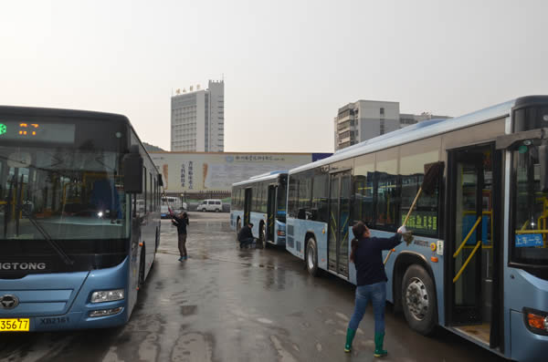 特別是雨后,所有管理人員、調度員、駕乘人員齊上陣,利用休停和晚收車(chē)后的時(shí)間,加班加點(diǎn)對2300多臺營(yíng)運車(chē)輛和各公交首末站、停車(chē)場(chǎng)、調度室等環(huán)境衛生進(jìn)行了徹底的衛生大掃除,清理衛生死角。由機關(guān)職能部室和服務(wù)督導隊,以及各營(yíng)運公司組成檢查組,每天都要在線(xiàn)路開(kāi)展衛生專(zhuān)項檢查。針對檢查中發(fā)現的問(wèn)題限期整改,責任到人。徐州公交在每臺車(chē)的前擋風(fēng)玻璃處放置了創(chuàng )衛標語(yǔ),在公交首末站懸掛創(chuàng )衛標語(yǔ)37個(gè),在700多臺公交車(chē)載電視中滾動(dòng)播出創(chuàng )衛宣傳片,制作了創(chuàng )衛健康宣傳專(zhuān)版30多個(gè),在每個(gè)調度室張貼了《中國公民健康素養66條》,在所有停車(chē)場(chǎng)、辦公區域、車(chē)廂內張貼了禁煙標識。